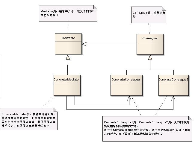 中介者模式,定义了一个中介对象来封装一系列对象之间的交互关系。中介者使各个对象之间不需要显式地相互引用,从而使耦合性降低,而且可以独立地改变它们之间的交互行为。具体的结构图如下所示:
