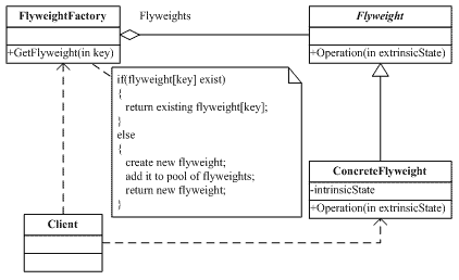 享元模式运用共享的技术有效地支持细粒度的对象,使其进行共享。在.NET类库中,String类的实现就使用了享元模式,String类采用字符串驻留池的来使字符串进行共享。更多内容参考博文:http://www.cnblogs.com/artech/archive/2010/11/25/internedstring.html 。享元模式的具体结构图如下所示。