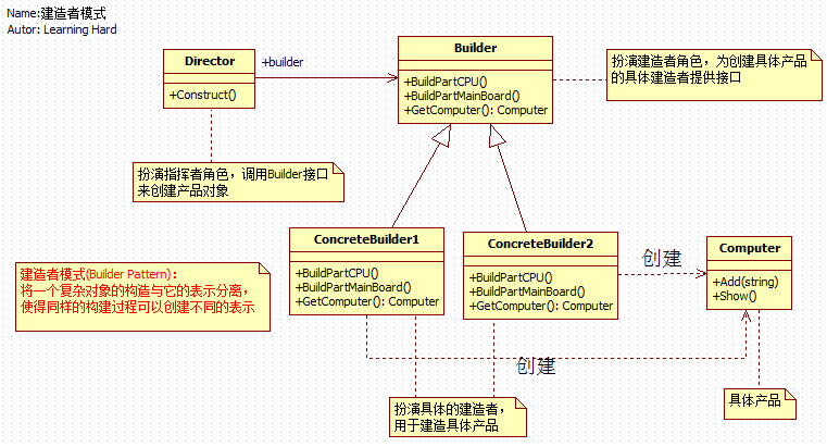 - 将产品的内部表示与产品的构造过程分割开来。问:如何把它们分割开呢?答:不要把产品的构造过程放在产品类中,而是由建造者类来负责构造过程,产品的内部表示放在产品类中,这样不就分割开了嘛。