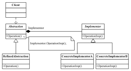 桥接模式旨在将抽象化与实现化解耦,使得两者可以独立地变化。意思就是说,桥接模式把原来基类的实现化细节再进一步进行抽象,构造到一个实现化的结构中,然后再把原来的基类改造成一个抽象化的等级结构,这样就可以实现系统在多个维度的独立变化,桥接模式的结构图如下所示。