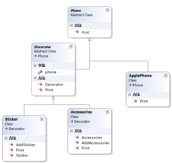 装饰者模式又称包装(Wrapper)模式,它可以动态地给一个对象添加一些额外的功能,装饰者模式较继承生成子类的方式更加灵活。虽然装饰者模式能够动态地将职责附加到对象上,但它也会造成产生一些细小的对象,增加了系统的复杂度。具体的结构图如下所示。