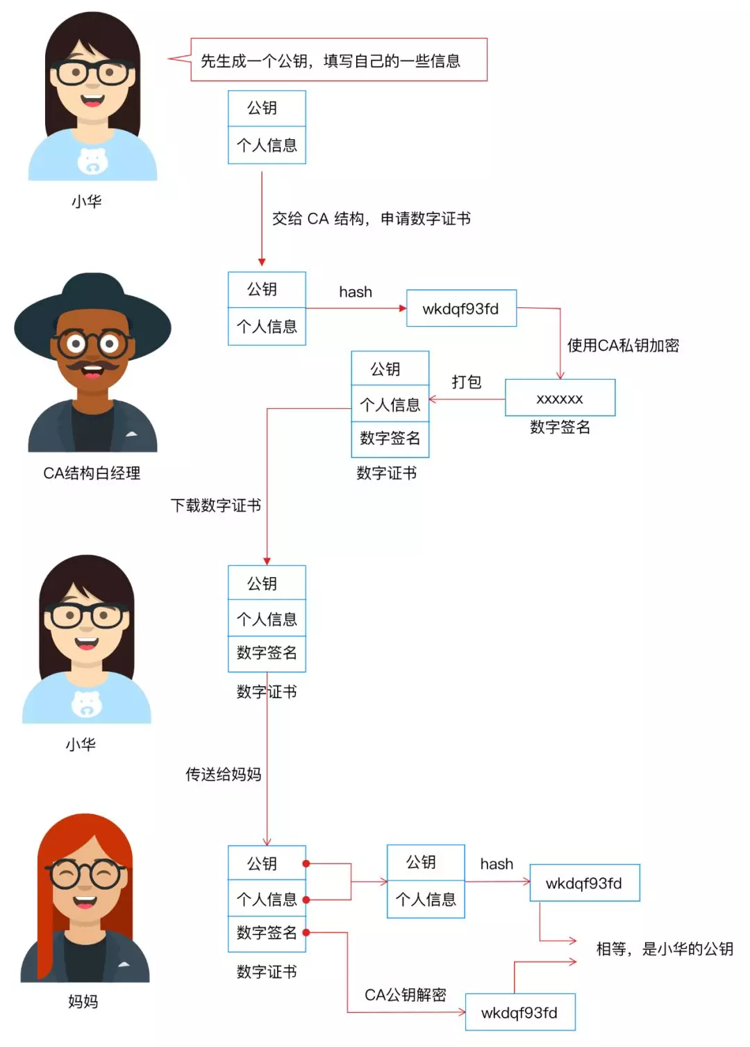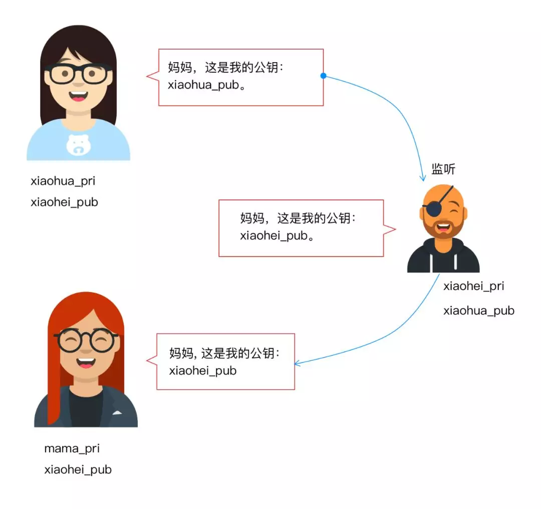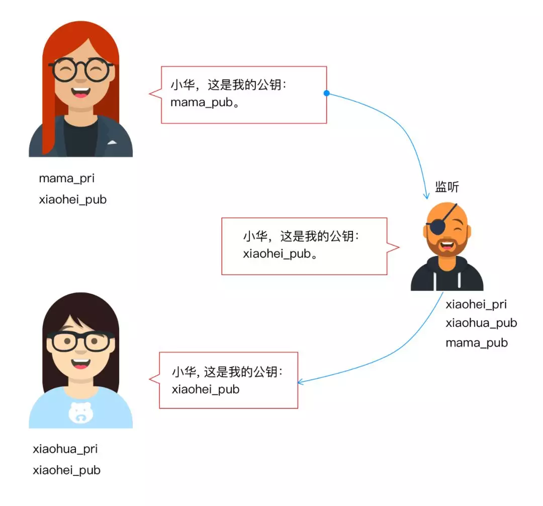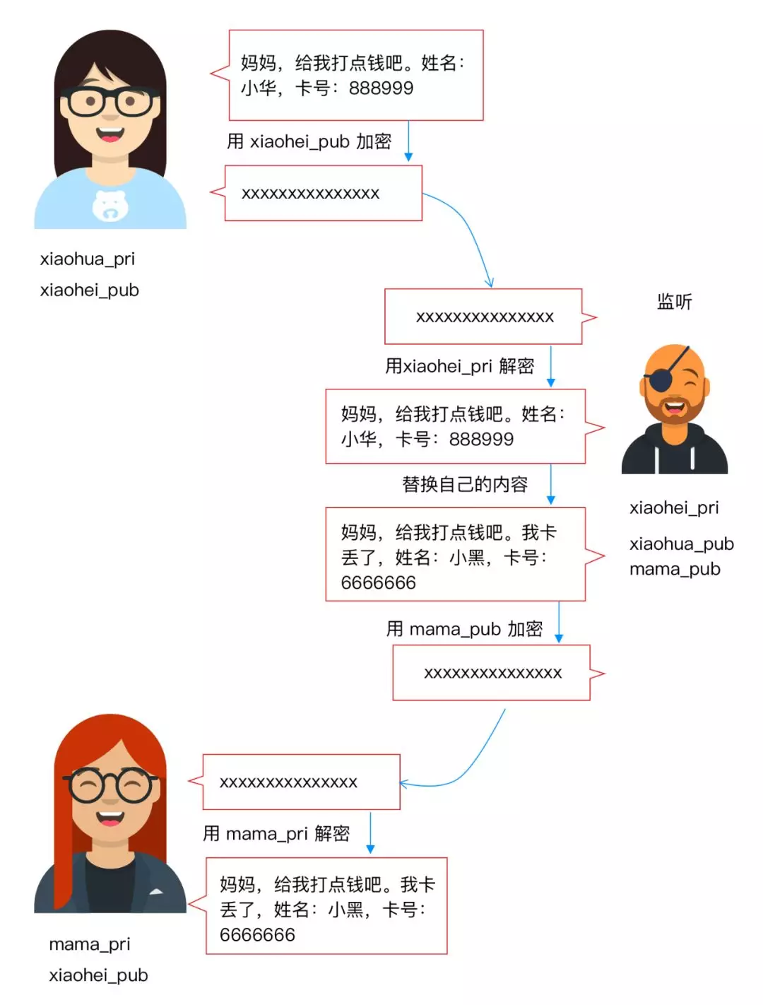 小华把自己的公钥 xiaohua_pub 发给妈妈,中途被小黑掉包了,小黑把自己的公钥 xiaohei_pub 发给了小华的妈妈。这样小华妈妈发消息的时候就使用了小黑的公钥进行了加密,小黑获取到消息表可以用自己的私钥进行解密。