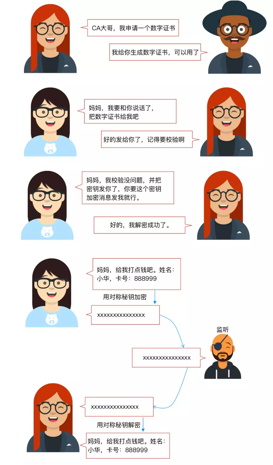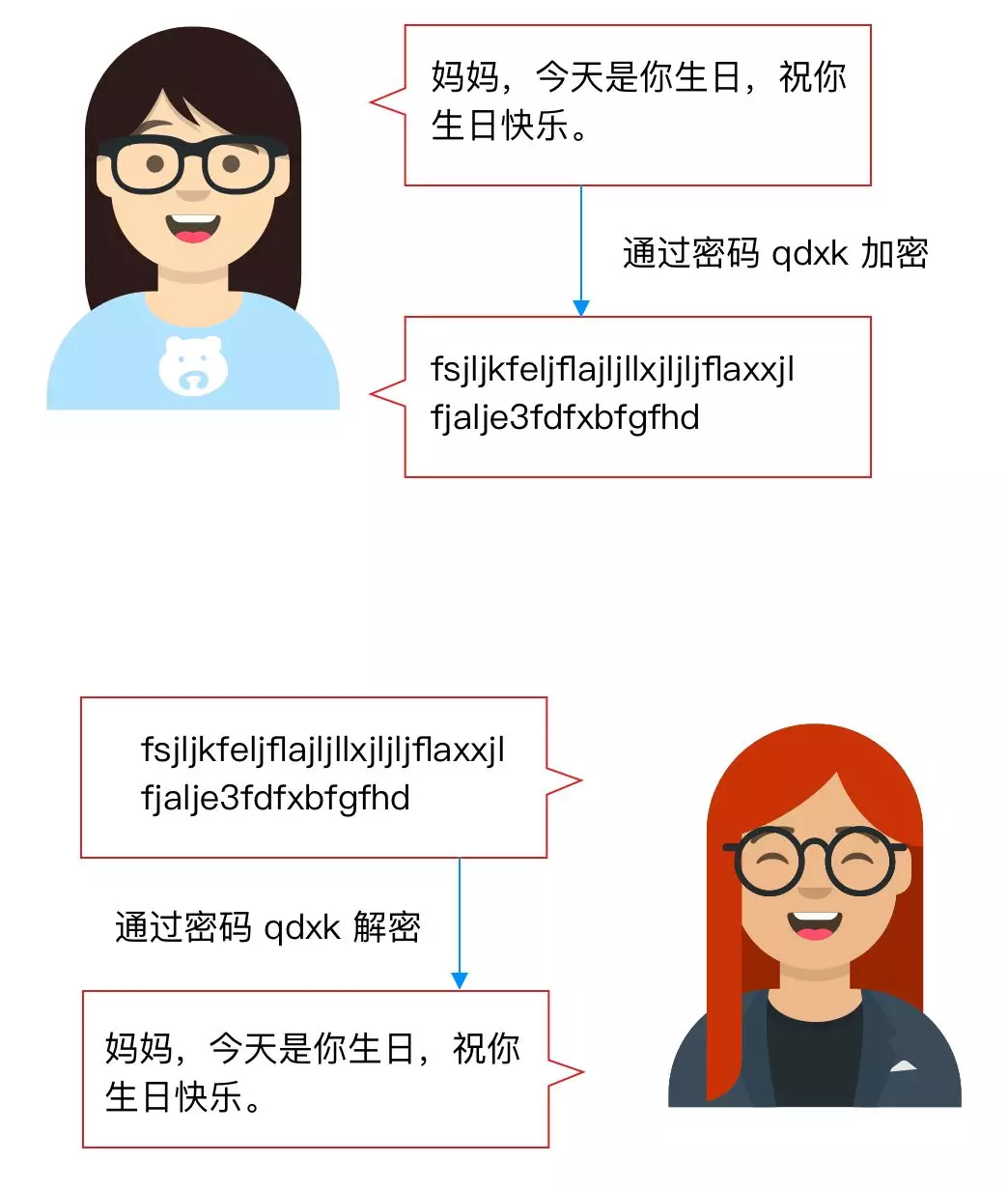 既然小华和她妈妈的聊天内容是明文传输的,那直接把内容加密不就完事了吗。小华和她妈妈就约定了一个密码,所有的内容都通过这个密码进行加密和解密。