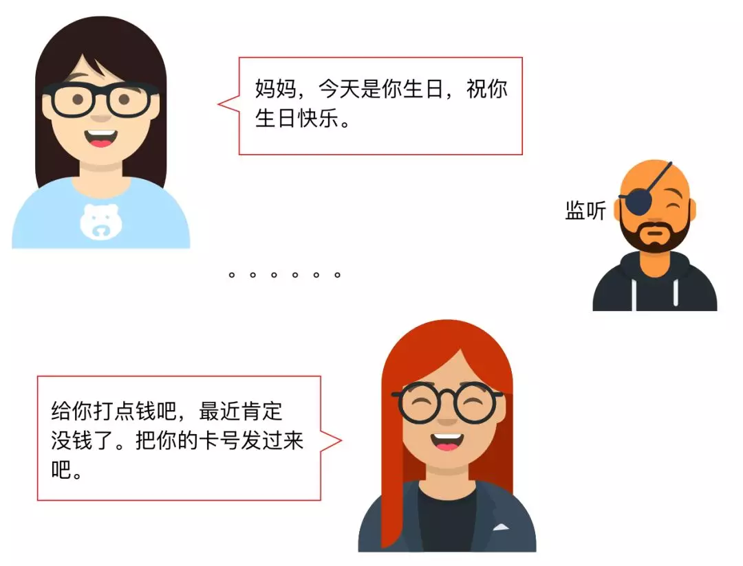 HTTP 协议是建立在 TCP 之上的,TCP 是否安全决定了 HTTP 是否安全。HTTP的报文内容并未加密,容易被监听和篡改。小黑就监听了母女二人的聊天内容,并对内容进行了篡改,伪装成女儿进行聊天。所以 HTTP 有以下 3 个问题: