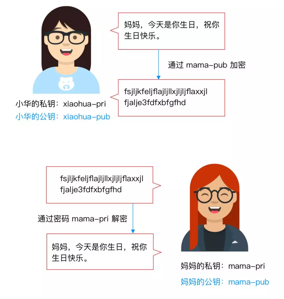 小华和妈妈,只把公钥交给对方就行。小华给妈妈发消息的时候,用妈妈的公钥进行加密,私钥只有妈妈有,也就是说只有妈妈能解密。