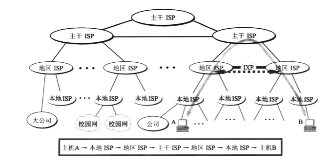 - 主机 A 和主机 B 通信的过程。主机 A --> 本地 ISP --> 地区 ISP --> 主干 ISP --> 地区 ISP --> 本地 ISP --> 主机 B