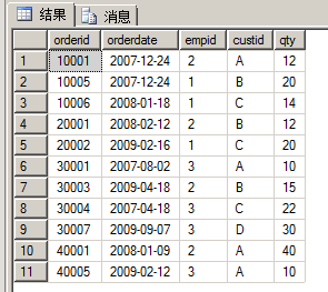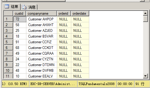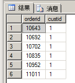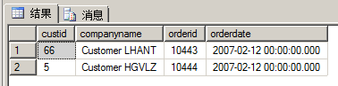 | 1 | select c.custid,c.companyname,o.orderid,o.orderdate |