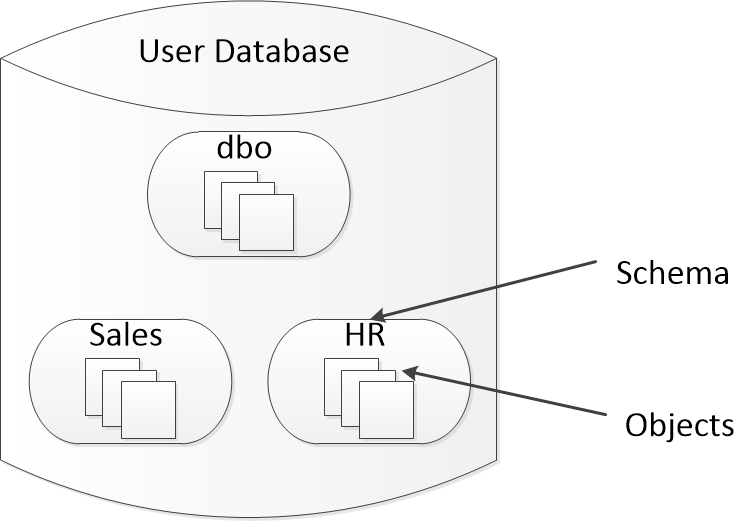 一个数据库包含多个架构,而每个架构又包括多个对象。可以将架构看作是各种对象的容器,这些对象可以是表(table)、视图(view)、存储过程(stored procedure)等等。