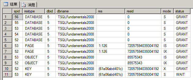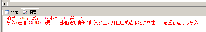 这里由于这个请求和 Connection A 中的事务在同一个资源上持有的排它锁发生了冲突,于是相互阻塞发生了死锁。SQL Server 通常会在几秒钟之内检测到死锁,并从这两个进程中选择一个作为牺牲品,终止其事务。所以我们还是得到了以下结果: