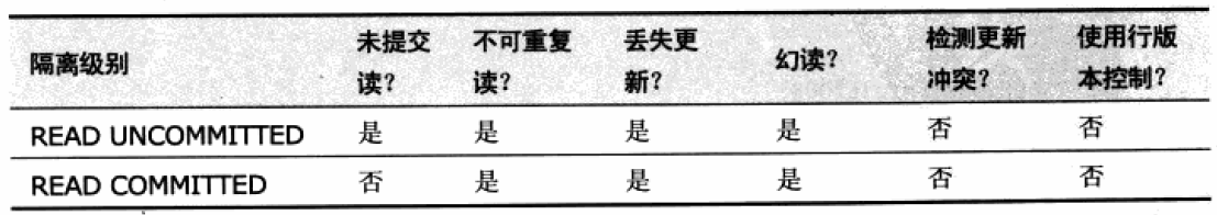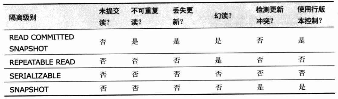 下表总结了每种隔离级别能够解决各种逻辑一致性的问题,以及隔离级别是否会检测更新冲突,是否使用了行版本控制。