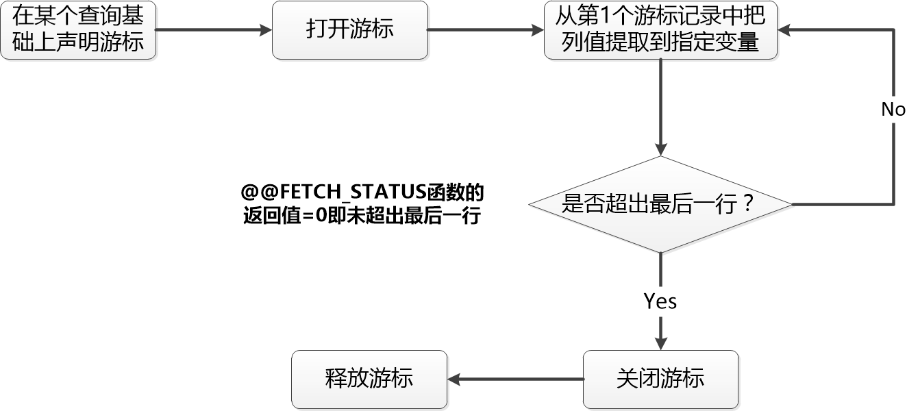 T-SQL 中支持一种叫做游标的对象,可以用它来处理查询返回的结果集中的各行,以指定的顺序一次只处理一行。这种处理方式与使用基于集合的查询相反,普通的查询是把集合作为一个整体来处理,不依赖任何顺序。
