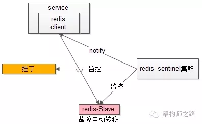自动故障转移:当 redis 主挂了的时候,sentinel 能够探测到,会通知调用方访问新的 redis,整个过程由 sentinel 和 redis 集群配合完成,对调用方是透明的。