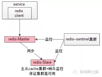 (4)【服务层】到【缓存层】的高可用,是通过缓存数据的冗余实现的,常见实践是缓存客户端双读双写,或者利用缓存集群的主从数据同步与 sentinel 保活与自动故障转移;更多的业务场景,对缓存没有高可用要求,可以使用缓存服务化来对调用方屏蔽底层复杂性;