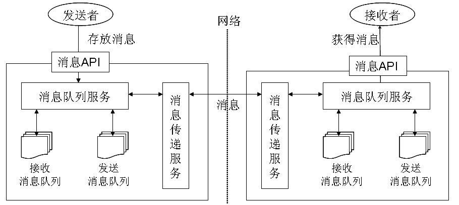 传统的点对点消息中间件通常由 消息队列服务、消息传递服务、消息队列 和 消息应用程序接口 API 组成,其典型的结构如下图所示。