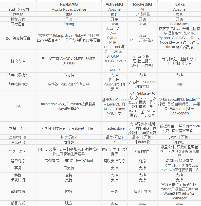 Kafka 在于 分布式架构,RabbitMQ 基于 AMQP 协议 来实现,RocketMQ 的思路来源于 Kafka,改成了 主从结构,在 事务性 和 可靠性 方面做了优化。广泛来说,电商、金融 等对 事务一致性 要求很高的,可以考虑 RabbitMQ 和 RocketMQ,对 性能要求高 的可考虑 Kafka。