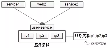 如上图,用户中心服务 user-service 有三个节点,ip1/ip2/ip3 对上游提供服务,任何一个节点当机,都不影响服务的可用性。