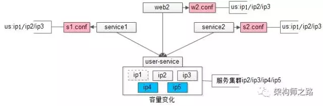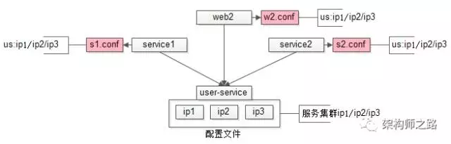 (3)service2 也调用了用户中心,同理有个配置文件 s2.conf,记录了 us 集群是 ip1/ip2/ip3;