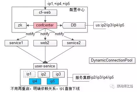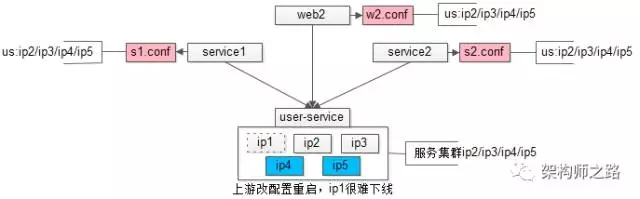 (3)所有上游需要拉取配置,需要去配置中心注册,拉取下游服务配置信息(ip1/ip2/ip3)。