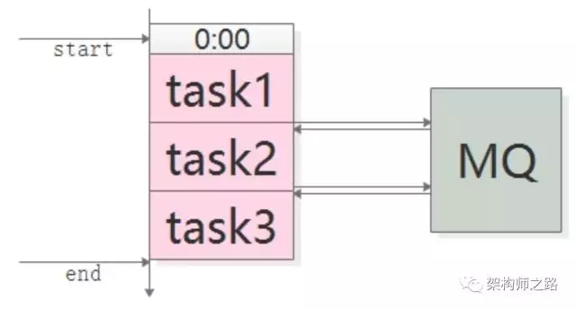 如上图,任务之间通过 MQ 来传递“开始”与“结束”的通知: