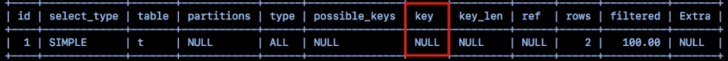 我们看下explain select * from t;的 KEY 结果是 NULL 。