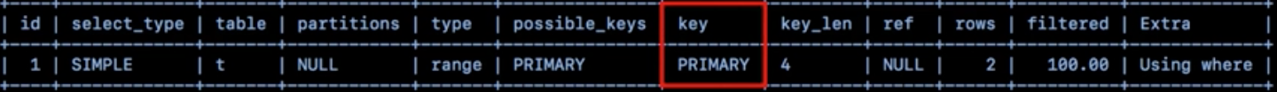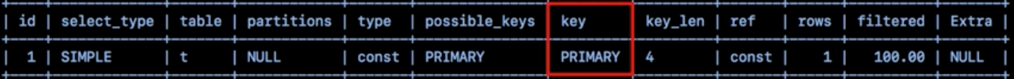explain select * from t where id=2;的 KEY 结果是 PRIMARY ,就是我们常说的使用了主键索引。