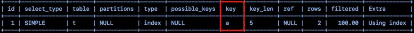 explain select a from t;的 KEY 结果是 a,表示使用了 a 这个索引。