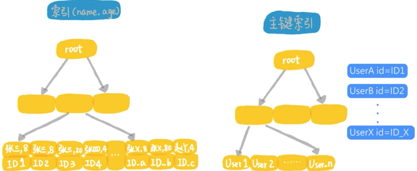 - 首先从联合索引上找到第 1 个年龄字段是张开头的记录,取出主键 id,然后到主键索引树上,根据 id 取出整行的值;